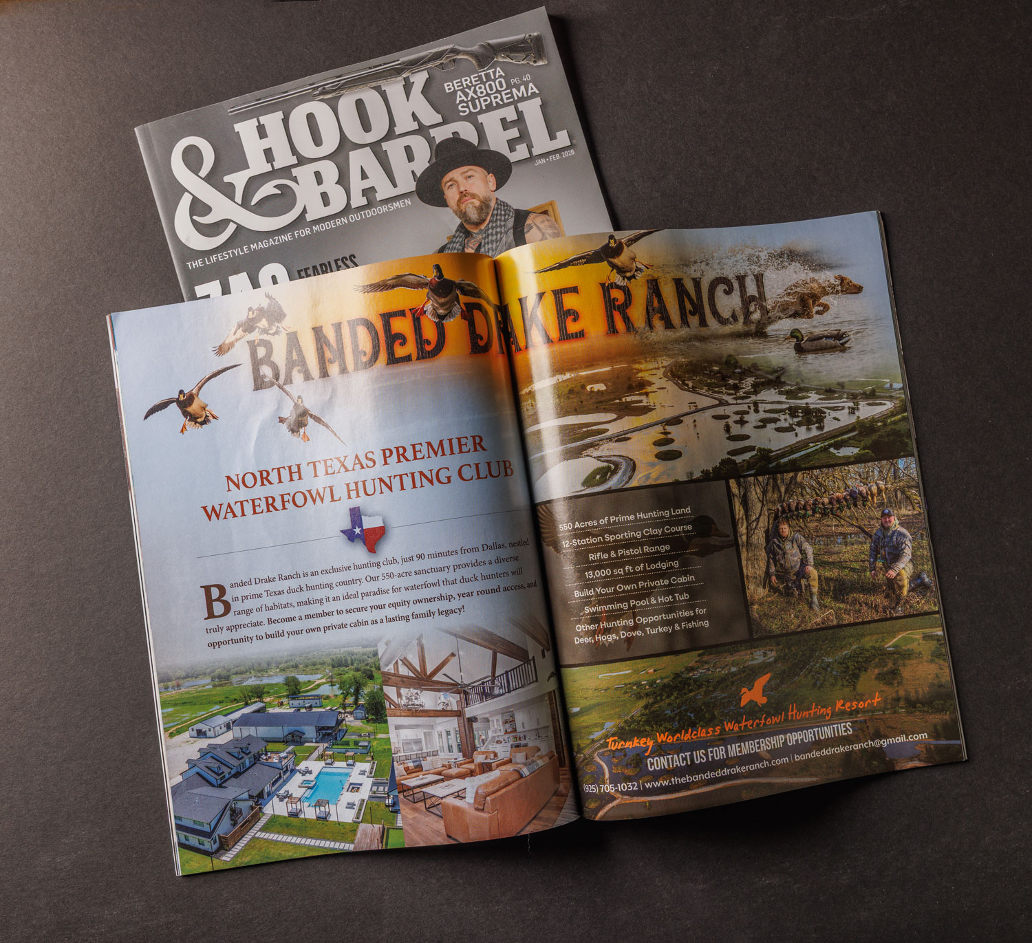 This print ad design was created for Banded Drake Ranch, a luxury premiere hunting lodge in North East Texas. The ad showed in Hook & Barrel Magazine Jan-Feb 2026 Issue.